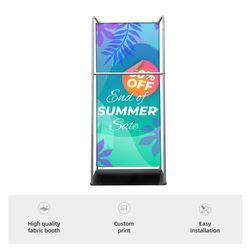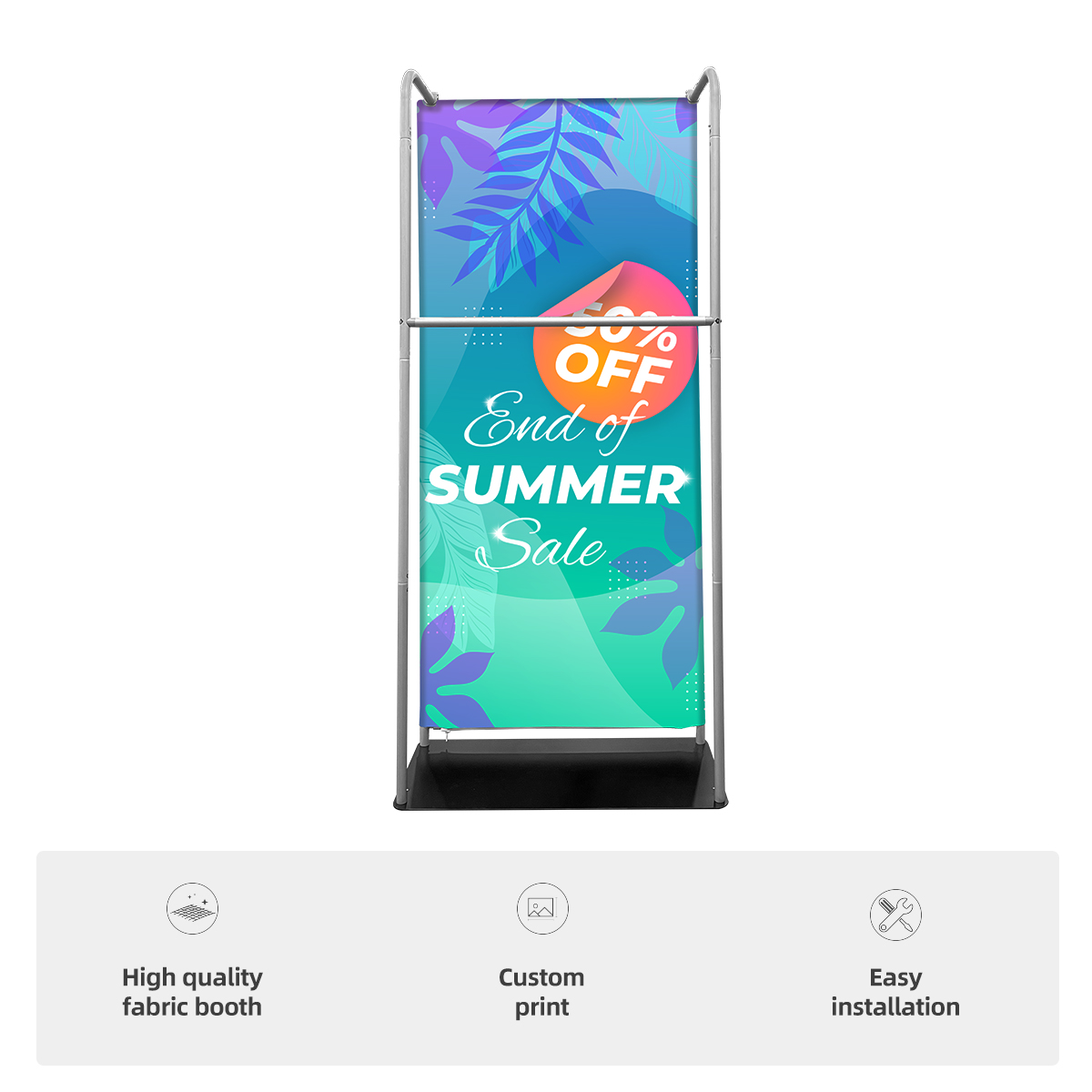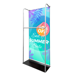 40"w x 89”h Straight Wall Display with side rails and crossbar for hangers. Vibrant full color dye sublimation imprint on one side, blank white polyester fabric on back. Simple no-tools set up and take down with free carry bag to hold all components. See other styles for double side imprint, other sizes, or for fabric only for replacement or alternative graphics.